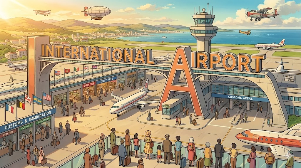 - 해석: 국경을 넘는 국제선 항공편이 뜨고 내릴 수 있는 시설과 세관을 갖춘 공항입니다.