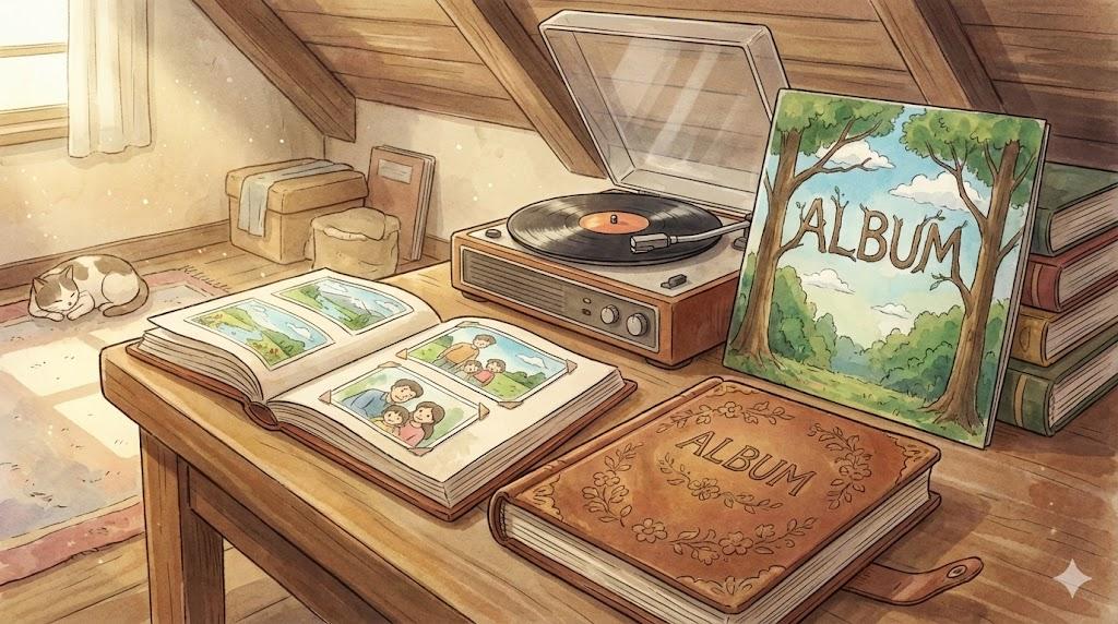 | 라틴어 album (흰 게시판) | "기록을 위한 빈 공간" | 빈 책/첩 (수집용) -> 사진첩/우표첩 -> (레코드판을 책처럼 묶음) 음악 앨범 |