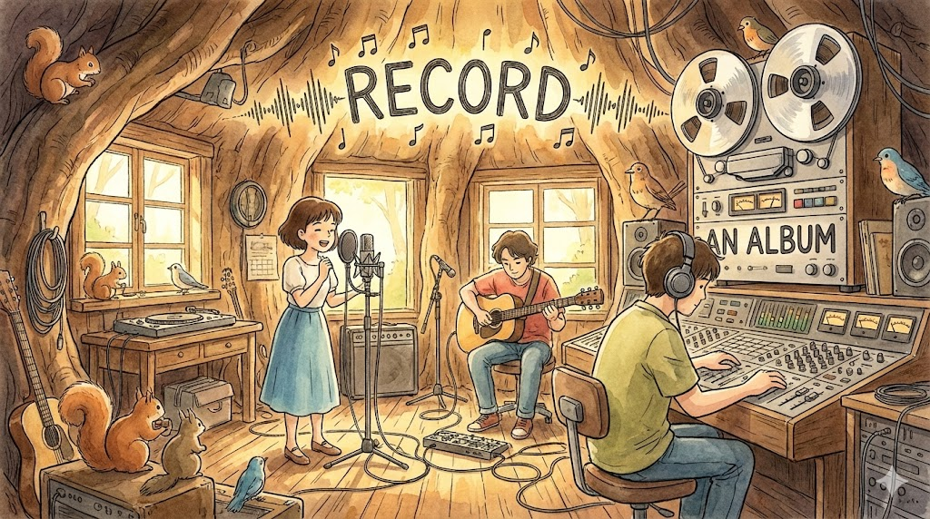 - 해석: 음반을 만들기 위해 스튜디오에서 노래나 연주를 녹음하는 과정을 뜻합니다.