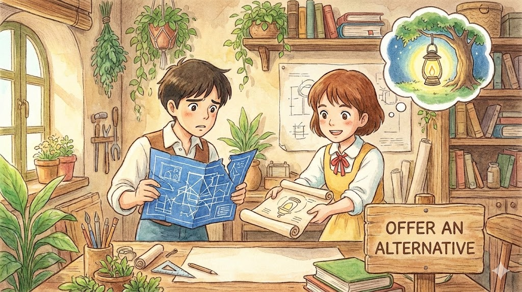 상대방의 제안을 거절하거나 문제가 생겼을 때, 단순히 안 된다고 하는 것이 아니라 "이건 어때요?" 하고 다른 해결책이나 선택지를 내놓는 건설적인 행동을 뜻합니다.