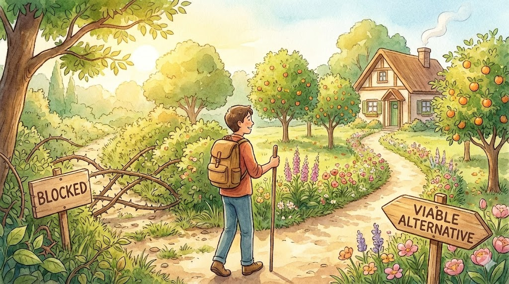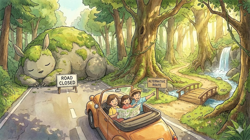 교통 체증이나 공사 등으로 인해 원래 가려던 길을 갈 수 없을 때, 대신 선택해서 갈 수 있는 '다른 경로'를 말합니다. 내비게이션에서 자주 듣는 말이며, 비유적으로 문제 해결을 위한 다른 방식을 뜻하기도 합니다.