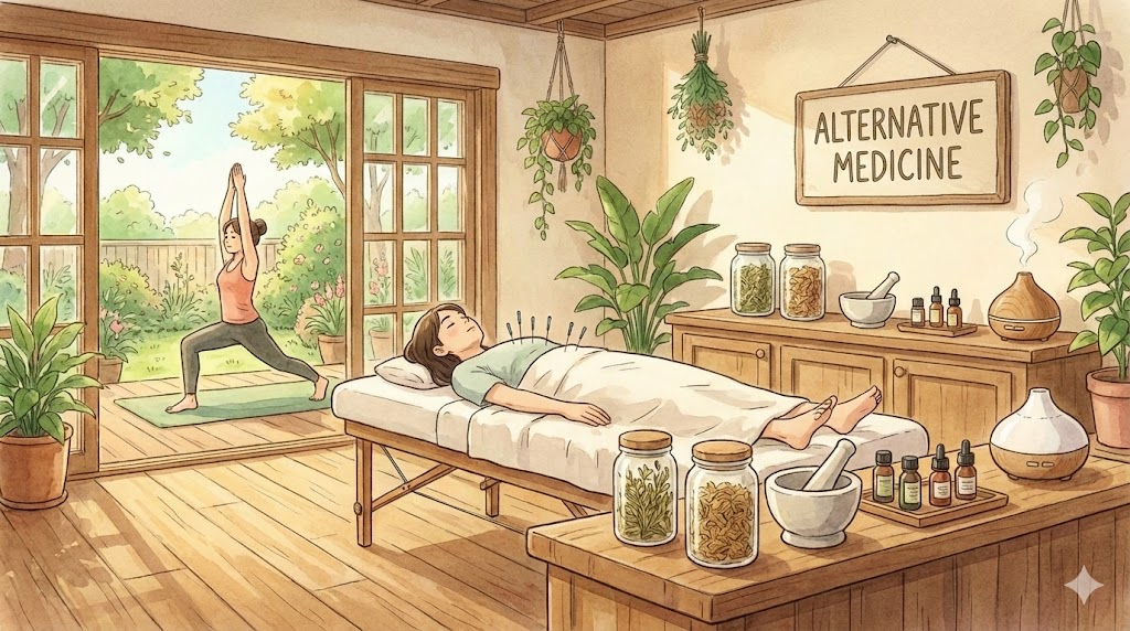 - 해석: 서양 의학의 정통 치료법이 아닌 침술, 약초 요법, 명상 등의 치료 방식을 통칭합니다.