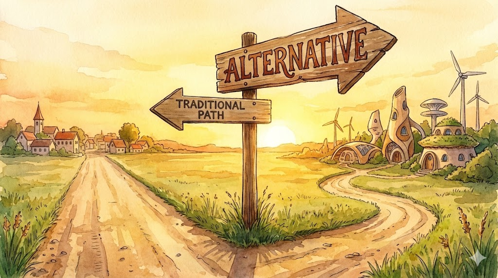- 예문: They chose an alternative lifestyle, living in a tiny house off the grid. (그들은 전력망을 벗어나 작은 집에서 사는 대안적 생활 양식을 선택했다.)