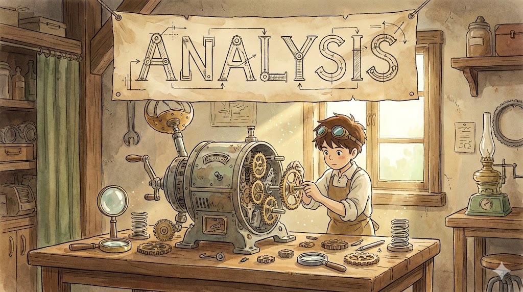 | 그리스어 analusis (풀어 헤침) | "매듭을 푸는 것" | 분해 (성분 쪼개기) → 분석/검토 (데이터/원인 파악) → 정신 분석 (심리 치료) |