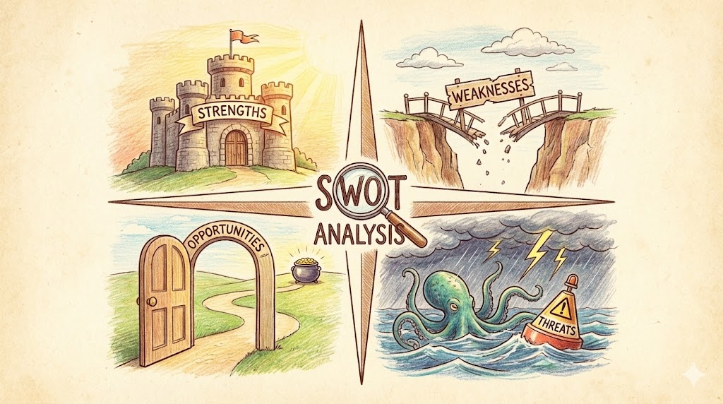기업이나 프로젝트의 현 상황을 파악하기 위한 전략적 기법입니다. Strengths(강점), Weaknesses(약점), Opportunities(기회), Threats(위협)의 앞글자를 딴 것으로, 마케팅이나 사업 계획 수립 시 필수적인 단계입니다.