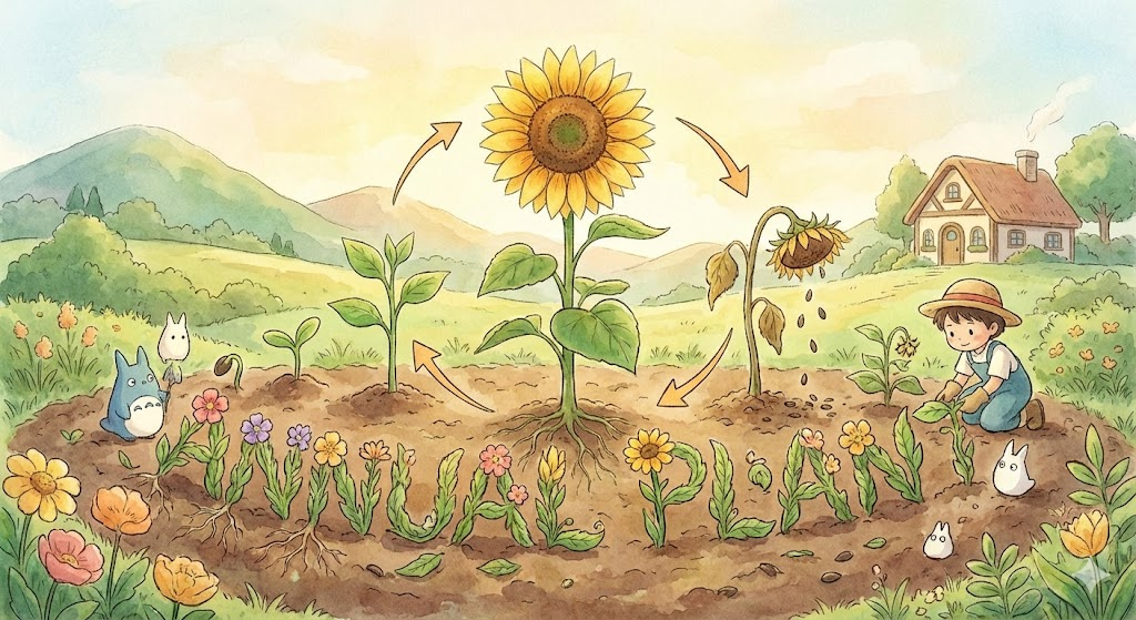 봄에 싹이 터서 꽃을 피우고 씨를 맺은 뒤, 겨울이 오기 전에 죽는 식물을 말합니다. 해바라기나 나팔꽃처럼 수명이 딱 1년인 식물입니다. (cf. Perennial: 다년생 식물)
