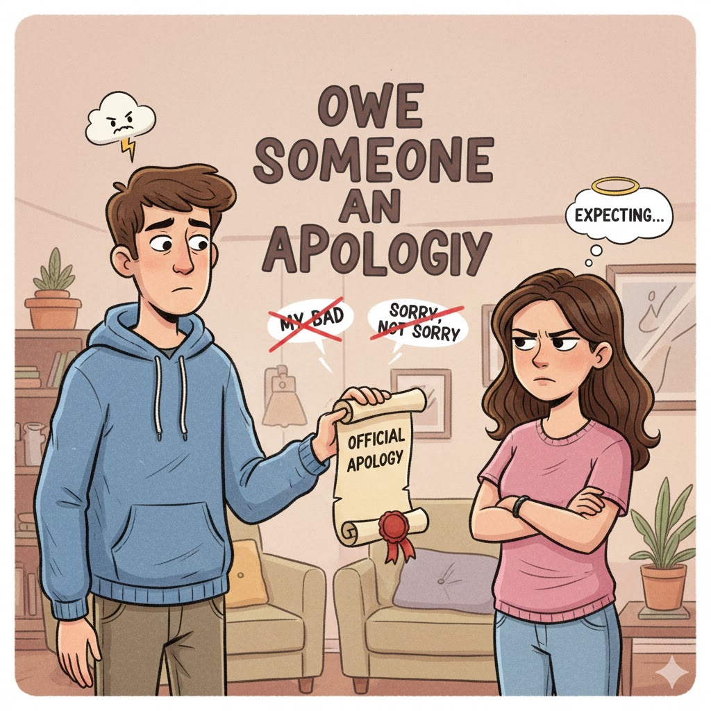 owe someone an apology [oʊ sʌmwʌn ən əˈpɑːlədʒi]