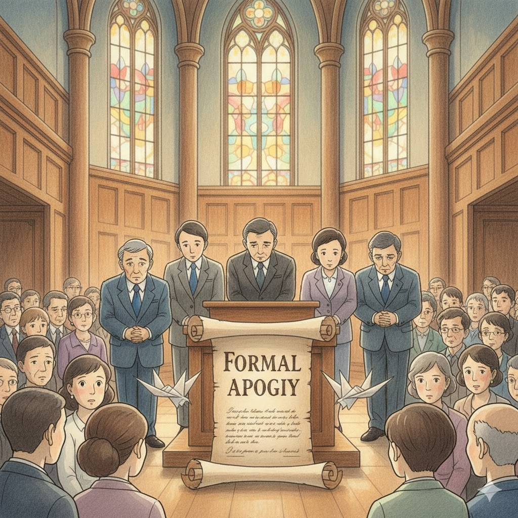가벼운 "미안해(Sorry)"가 아니라, 격식을 갖추어 정중하게 하는 사과를 말합니다. 기업이 소비자에게 하거나, 국가 간에, 혹은 공적인 자리에서 발표하는 사과 성명 등을 가리킵니다.