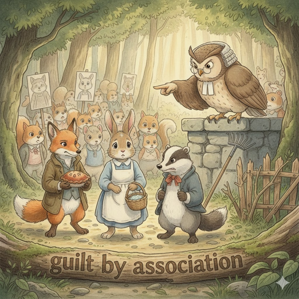 - 해석: 자신이 직접 잘못한 것이 아니라, 잘못된 사람들과 어울리거나 관련이 있다는 이유만으로 비난받는 것입니다.
