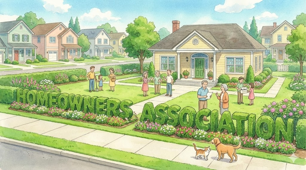 미국의 주택 단지나 아파트 단지에서 거주 환경을 관리하고 규칙을 정하는 주민 자치 조직입니다. 잔디 깎기, 페인트 색깔, 주차 규정 등을 아주 깐깐하게 관리하는 것으로 유명합니다. 줄여서 'HOA'라고 부릅니다.