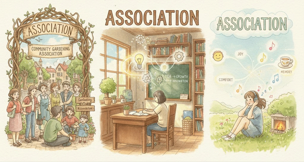 'association'은 기본적으로 "협회", "연합"이라는 조직을 뜻하거나, 두 대상 사이의 "연관성", "관련", 또는 어떤 것을 볼 때 다른 것이 떠오르는 "연상"을 의미합니다. 사회, 심리, 비즈니스 지문에서 아주 빈번하게 등장하는 필수 단어입니다.