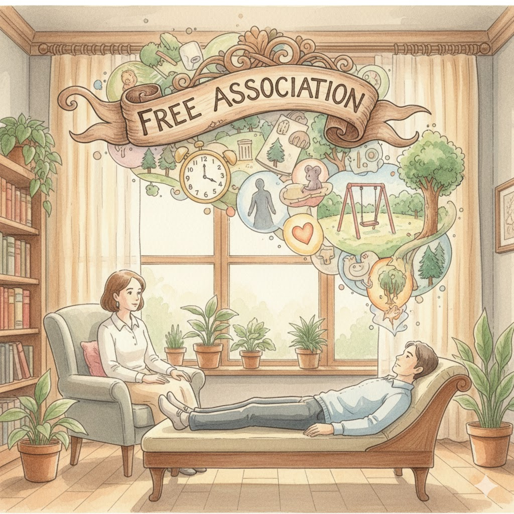 지그문트 프로이트나 심리 치료 관련 지문에서 Free Association(자유 연상)은 필수 개념입니다. 환자가 소파에 누워 떠오르는 대로 말하는 장면을 묘사하거나, 무의식의 흐름을 설명할 때 등장합니다.