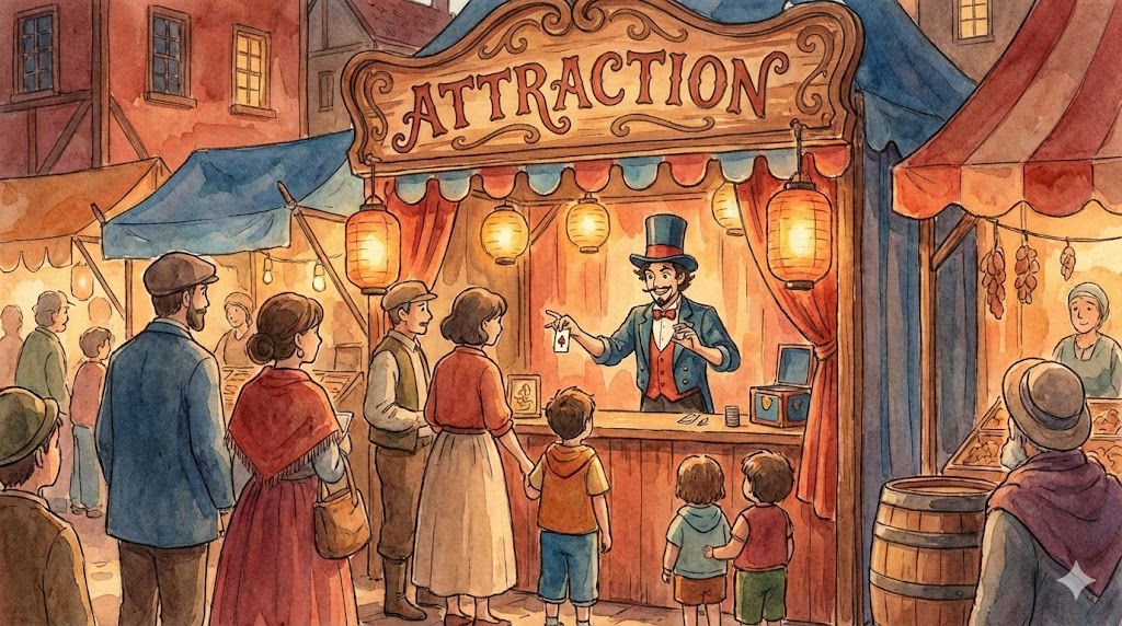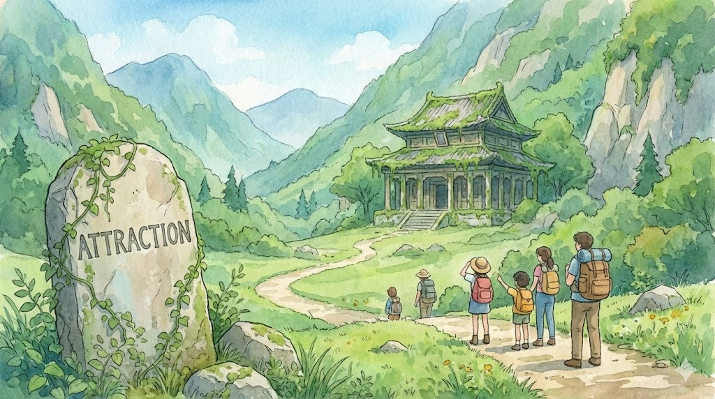 | 라틴어 attractio (끌어당김) | "내 쪽으로 오게 함" | 인력 (물리적 힘) → 매력/호감 (심리적 끌림) → 명소/구경거리 (사람을 끄는 곳) |