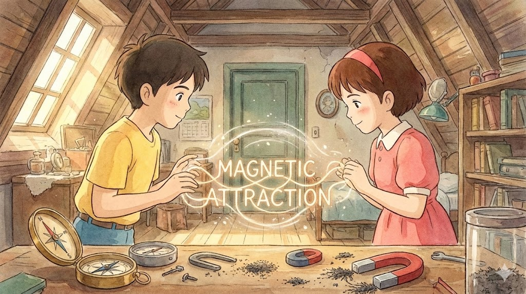 자석의 N극과 S극이 서로 달라붙으려는 힘을 말합니다. 비유적으로는 마치 자석에 이끌리듯 두 사람이 강렬하게 서로에게 끌리는 상황을 묘사할 때도 씁니다.