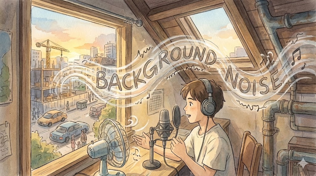 주된 소리가 아닌, 주변에서 들리는 웅성거림, 차 소리, 에어컨 소리 같은 쉭쉭거리는 소리를 말합니다. 집중을 방해하거나 녹음 품질을 떨어뜨리는 원인이 됩니다.