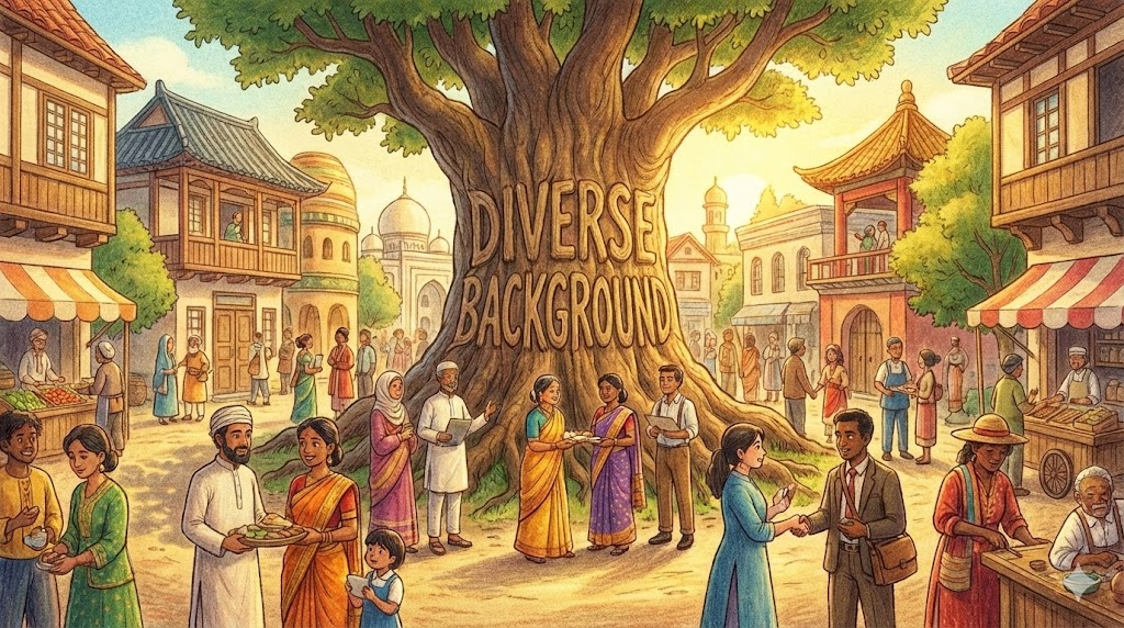 - 해석: 출신, 경험, 인종 등이 획일적이지 않고 여러 가지가 섞여 있는 상태입니다.
