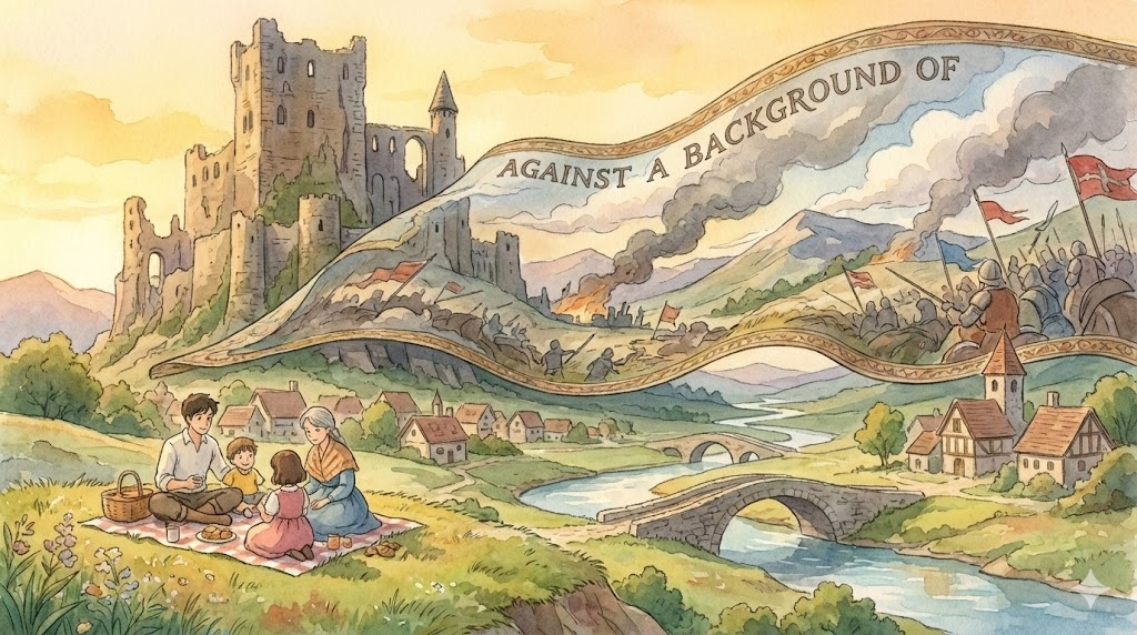 사진에서 뒤에 무엇을 두고 찍었다는 뜻도 되지만, 뉴스에서는 어떤 역사적 사건, 경제 위기, 전쟁 같은 '상황(context)' 속에서 어떤 일이 일어났다고 설명할 때 아주 많이 씁니다.