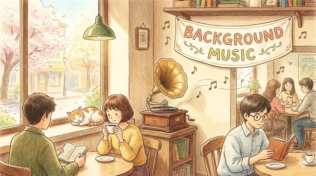 식당, 상점, 영화, 게임 등에서 분위기를 띄우기 위해 깔아놓은 음악입니다. 줄여서 'BGM'이라고 부릅니다.