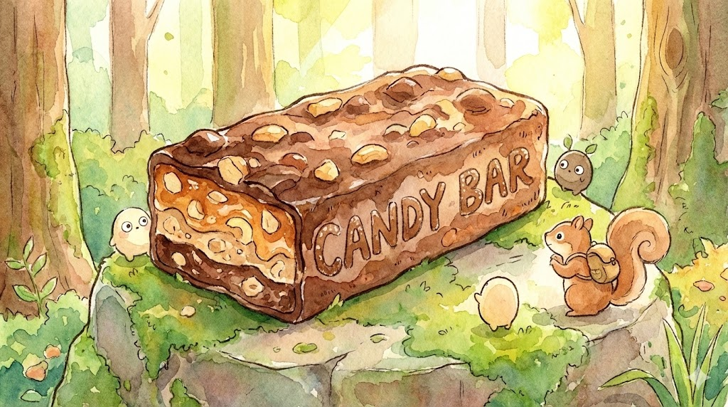단순한 사탕이 아니라, 초콜릿, 캐러멜, 견과류 등을 섞어서 직사각형 막대 모양으로 만든 간식을 말합니다. 스니커즈(Snickers)나 자유시간 같은 것을 생각하면 됩니다.