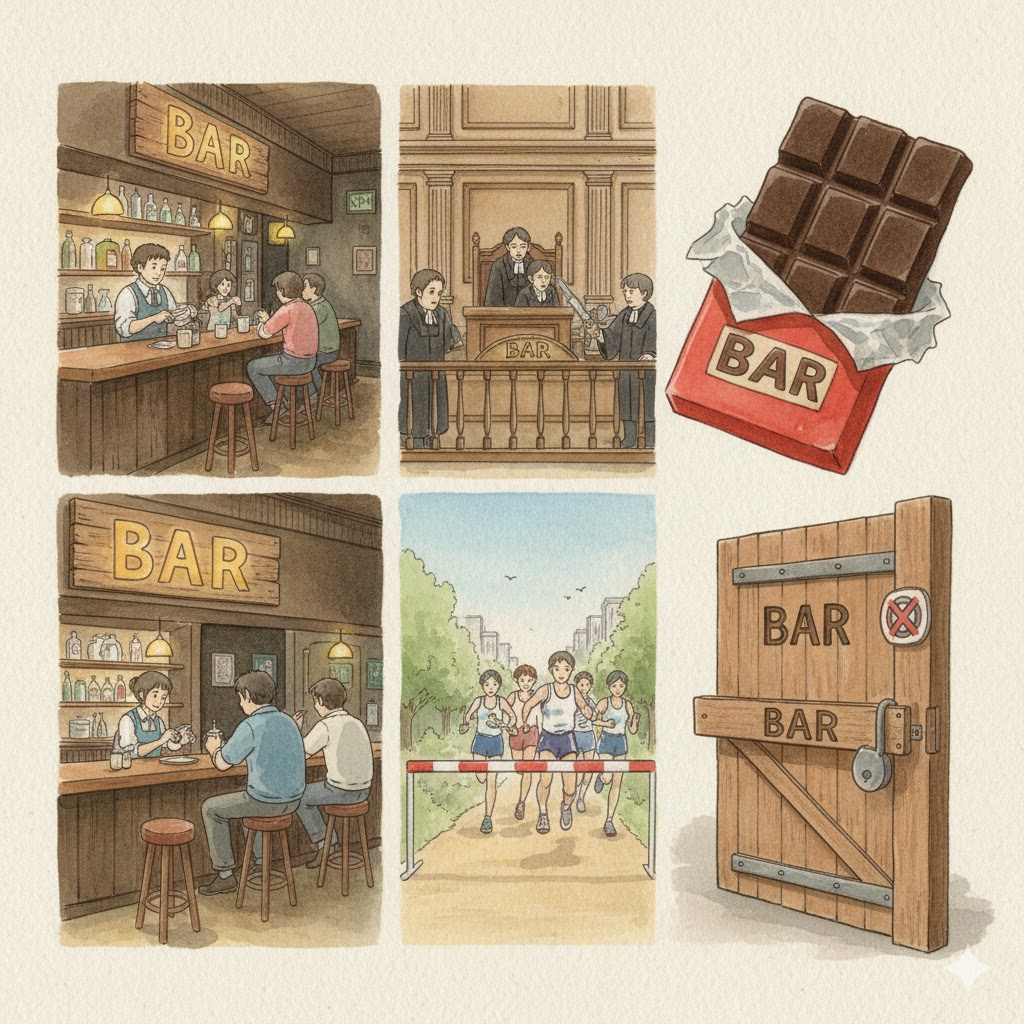 'bar'는 기본적으로 긴 막대기 모양의 물건("막대", "빗장")을 뜻하지만, 여기서 파생되어 "술집", 법정의 칸막이에서 유래한 "법조계(변호사)", 진행을 막는 "장애물", 그리고 기준을 나타내는 "수준"까지 매우 다양한 뜻을 가집니다.
