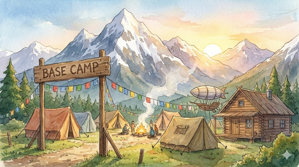 원래는 에베레스트 같은 높은 산을 오를 때, 등반가들이 물자를 보관하고 휴식을 취하기 위해 산기슭에 설치하는 든든한 거점을 말합니다. 비유적으로는 어떤 큰 목표를 향해 나아가기 위한 출발점이나 근거지를 뜻합니다.