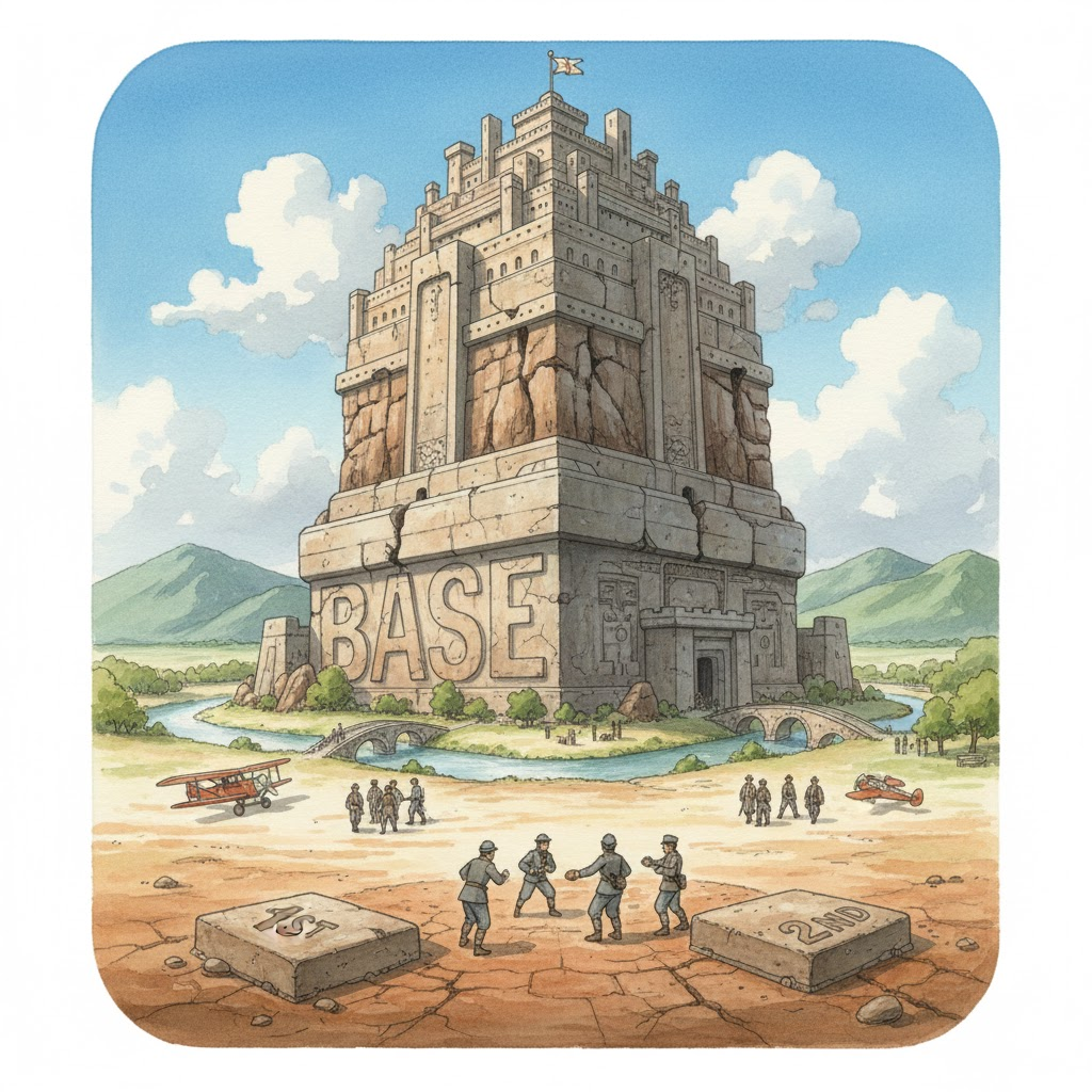 | 그리스어 basis (걸음/디딤대) | "딛고 서는 곳" | 맨 아랫부분 (물체의 바닥) → 기초/토대 (건물/이론의 기반) → 기지/본부 (활동의 거점) → (야구) 루 (밟는 곳) |