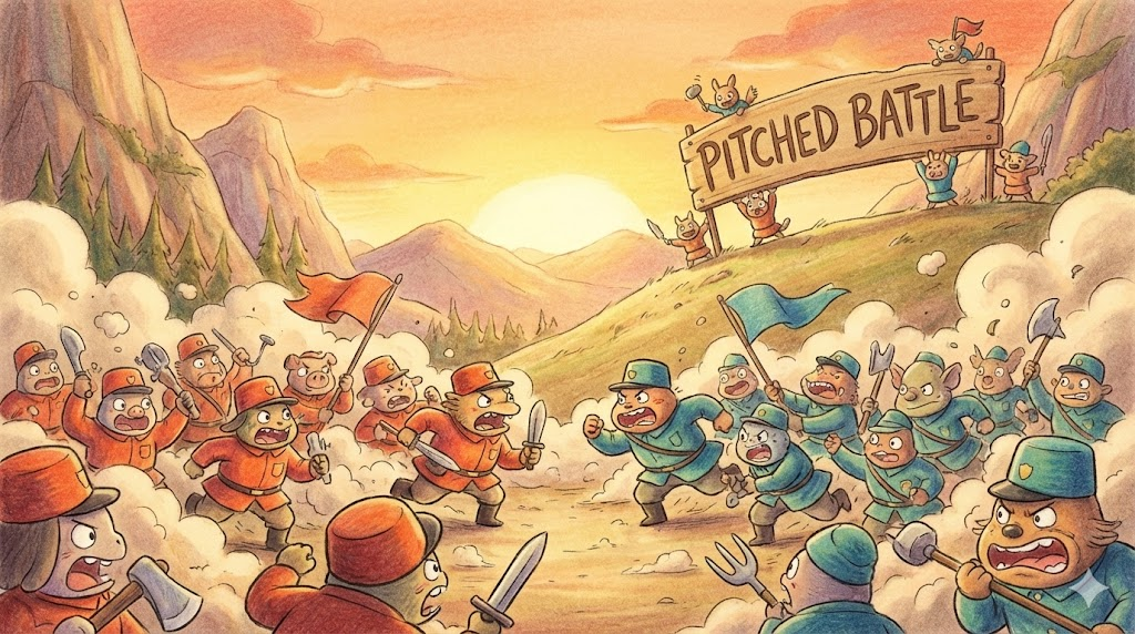 - 해석: 양측이 정해진 장소와 시간에서 전력을 다해 맞붙는 격렬한 전투입니다.