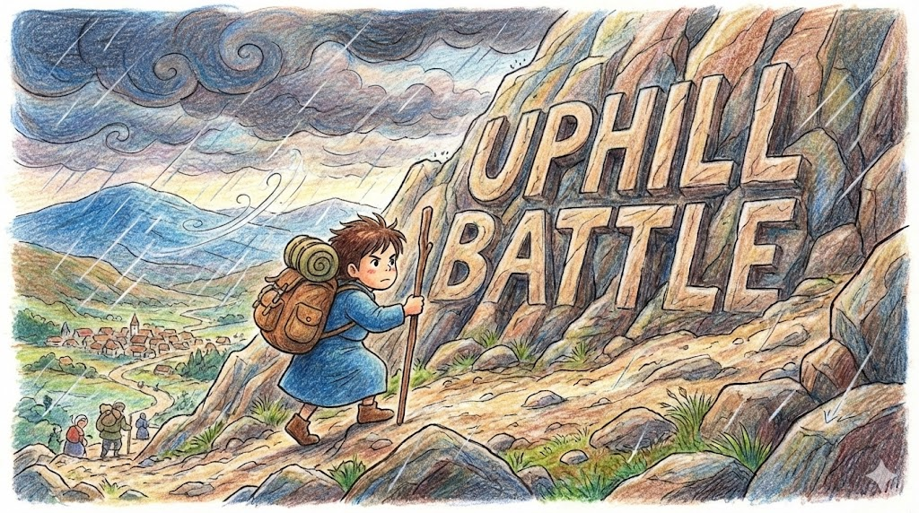 가파른 언덕(uphill)을 걸어 올라가는 것처럼, 중력을 거스르는 듯한 엄청난 노력이 필요하고 성공하기 어려운 상황을 말합니다. 불리한 조건에서 시작하거나 장애물이 많을 때 주로 씁니다.