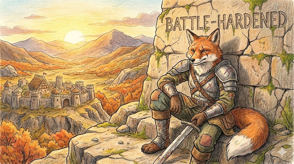 - 해석: 잦은 전투나 힘든 경험을 통해 단련되어 강인하고 노련해진 상태를 묘사하는 형용사입니다.