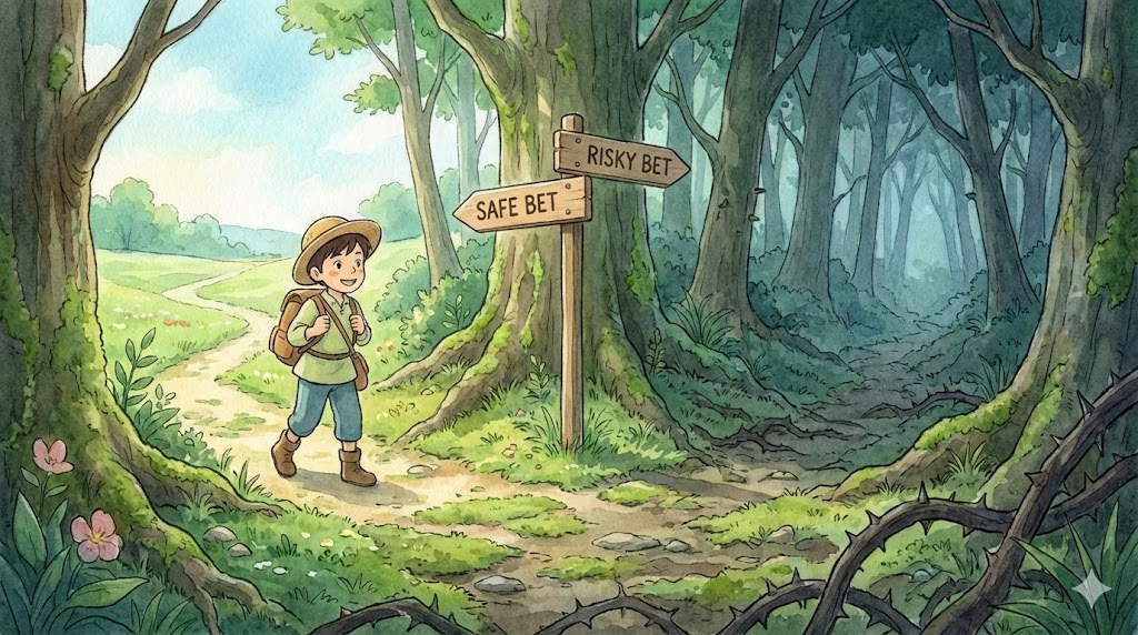 위험 부담이 적고 실패할 확률이 거의 없는 선택을 말합니다. 대박은 아닐지라도 쪽박 찰 일은 없는, 가장 무난하고 믿을 만한 대안을 이야기할 때 씁니다.