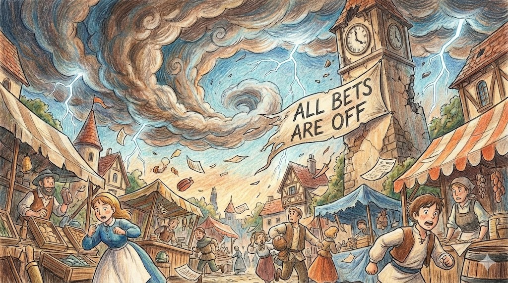 경마나 도박에서 예기치 못한 사태(말의 부상 등)로 인해 걸어둔 돈이 모두 무효 처리되는 상황에서 유래했습니다. 상황이 급변하여 이전의 예측이나 계획이 더 이상 통하지 않고, 앞으로 무슨 일이 벌어질지 아무도 모르는 혼돈 상태를 말합니다.