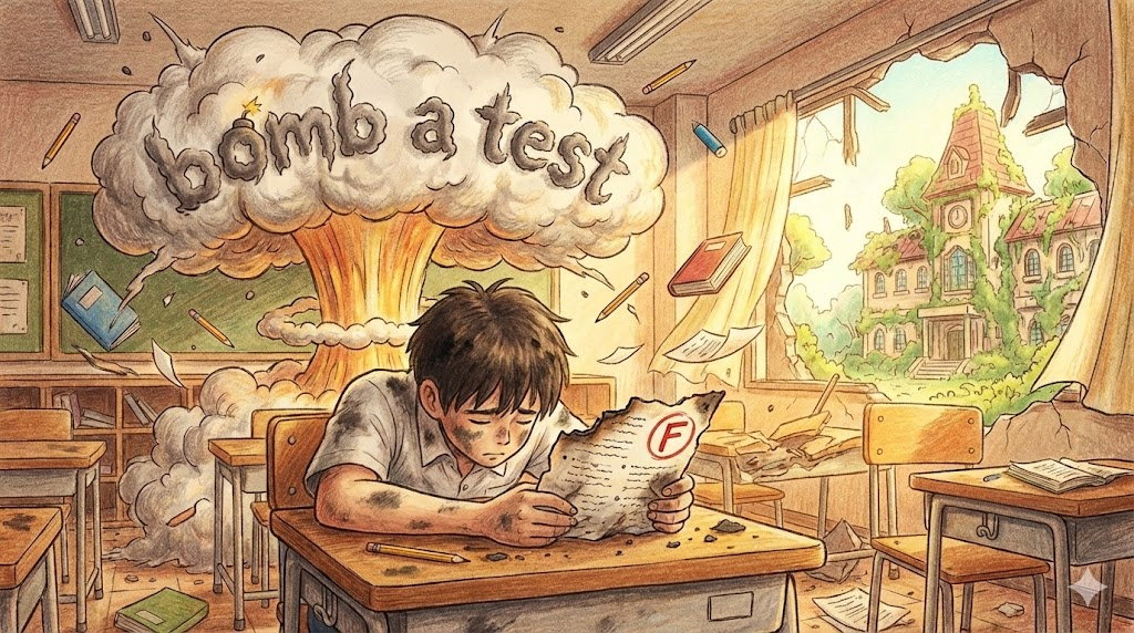 미국식 속어로, 시험 점수가 형편없게 나왔거나 아예 낙제했을 때 씁니다. 폭격을 맞아 폐허가 된 것처럼 결과가 처참하다는 뜻입니다. 반대로 영국에서는 "go down a bomb"이 '대성공하다'라는 뜻이라서 주의해야 합니다.