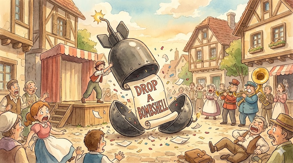 - 해석: 예기치 못한 깜짝 놀랄 만한 소식(bombshell)을 갑자기 발표하여 사람들을 충격에 빠뜨리는 것입니다.