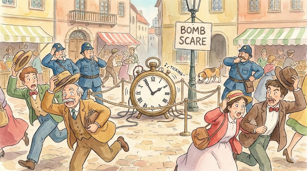 - 해석: 폭탄이 있다는 위협이나 신고가 있어 사람들이 대피하는 등의 소동(실제로는 없는 경우가 많음)입니다.