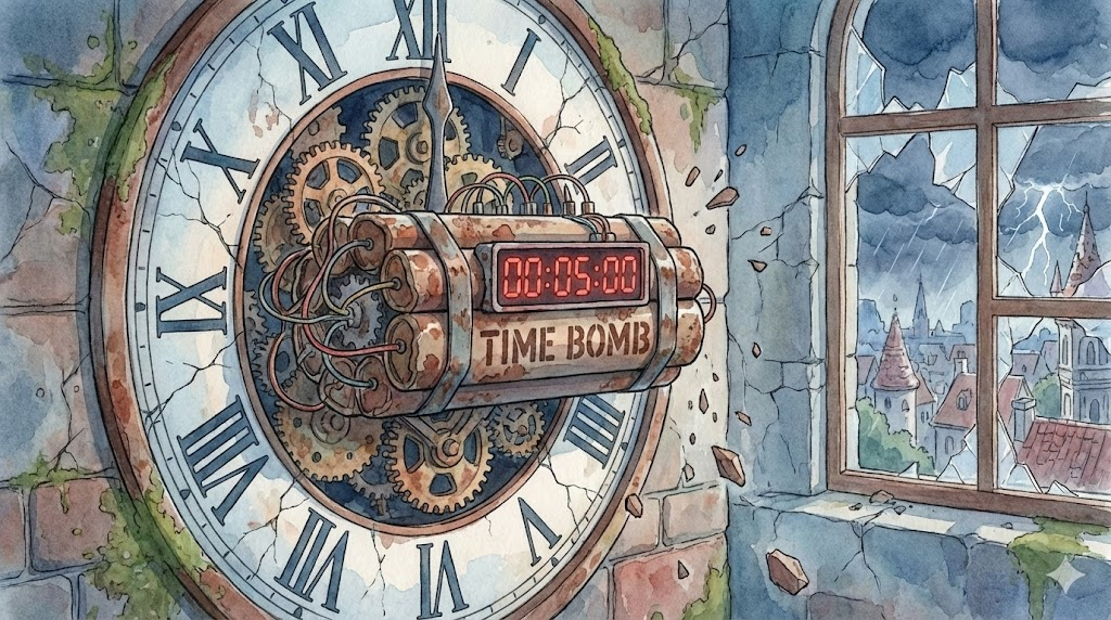 - 해석: 정해진 시간에 터지도록 설정된 폭탄, 또는 시간이 지남에 따라 결국 큰 문제가 될 위험한 상황을 비유합니다.