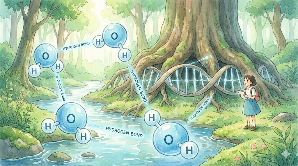 물 분자나 DNA 구조에서 수소 원자 사이에 작용하는, 비교적 약하지만 매우 중요한 결합입니다. 물이 끓는점이 높고, DNA가 이중 나선 구조를 유지하는 이유가 바로 이 수소 결합 때문입니다.