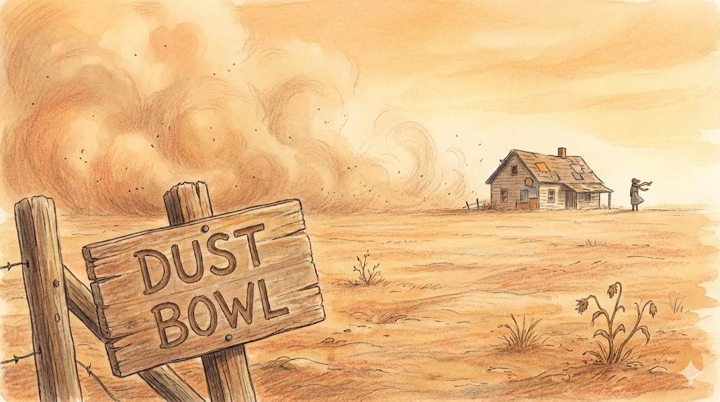 미국 역사나 환경 지문에서 The Dust Bowl은 1930년대 대공황(Great Depression) 시기와 맞물린 환경 재앙으로 등장합니다. 과도한 경작과 가뭄이 원인이며, 이로 인한 대규모 이주(Migration)가 주제로 다뤄집니다.