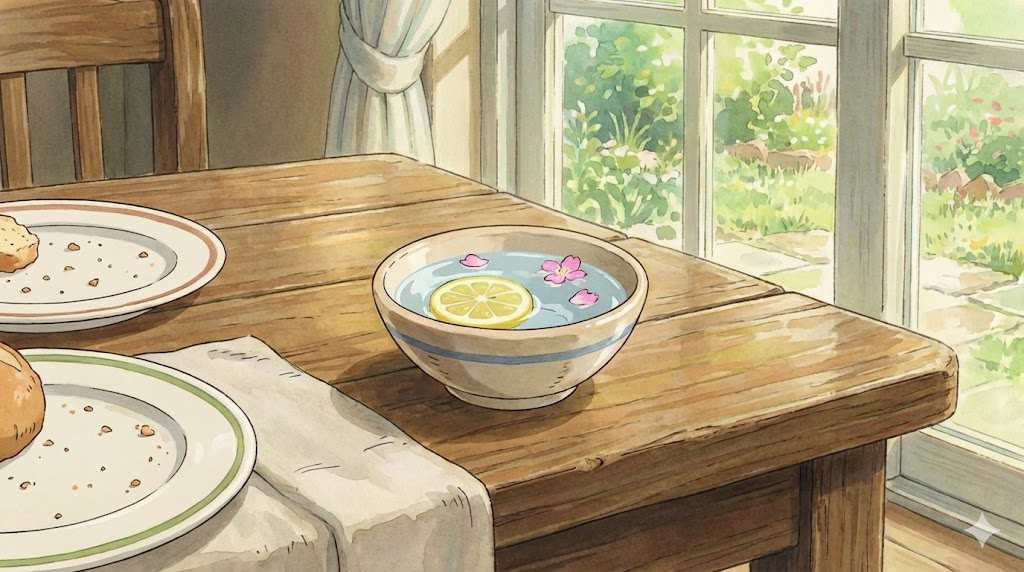 - 해석: 식사 중에 손가락을 씻을 수 있도록 식탁에 내놓는 작은 물그릇입니다.