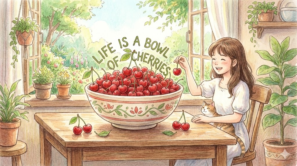 life is a bowl of cherries는 인생은 체리 한 그릇처럼 '즐겁고 좋은 것'이라는 뜻의 관용구인데, 종종 "인생이 항상 즐거운 건 아니다(Life is not just a bowl of cherries)"라고 반어적으로 더 많이 쓰입니다.