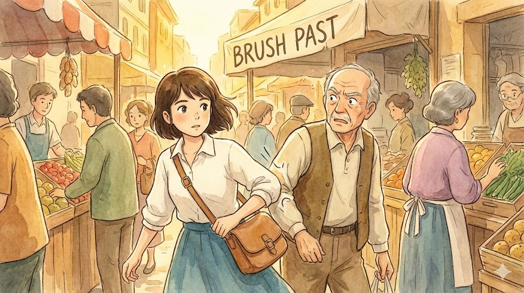 - Someone brushed past me in the crowded hallway. (누군가 붐비는 복도에서 나를 휙 스치고 지나갔다.)