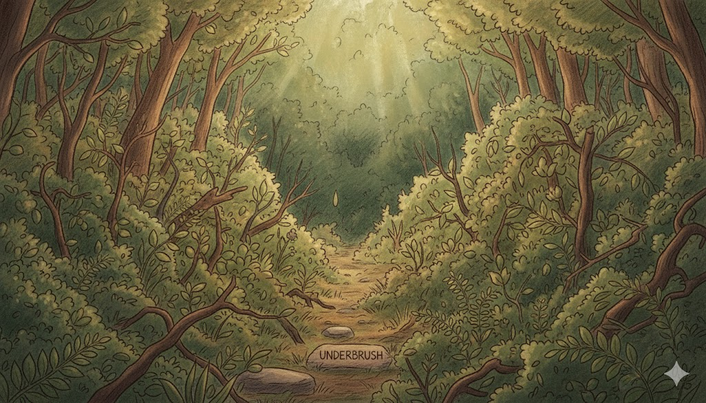숲의 큰 나무들 아래(Under) 쪽 바닥에 자라는 잡초, 덤불, 작은 나무(Brush)들이 엉켜 있는 수풀을 말합니다. 이것이 많으면 숲을 걸어 다니기 힘들고, 산불이 나면 불쏘시개 역할을 하기도 합니다.