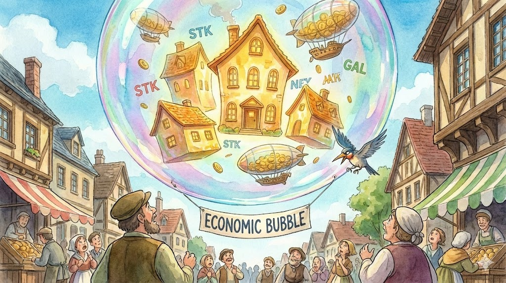 비문학 경제 지문에서 Bubble은 자산 가격의 비이성적 폭등(Inflation)과 급격한 붕괴(Burst/Crash)를 설명하는 핵심 키워드입니다. 역사적 사례로 "네덜란드 튤립 파동(Tulip Mania)" 이나 "닷컴 버블" 지문이 나올 때 반드시 등장합니다.