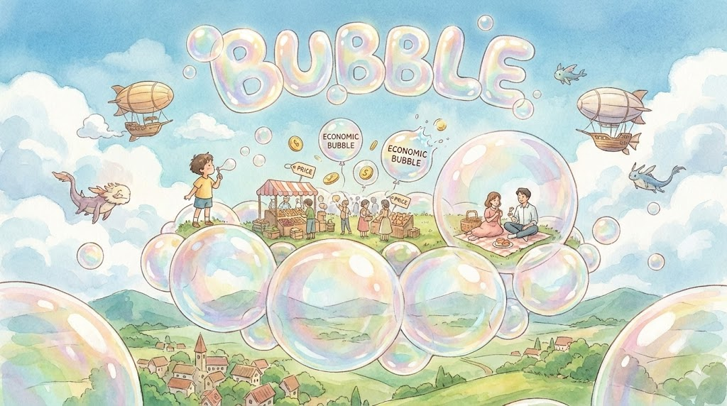 economic bubble은 실제 가치보다 가격이 부풀려진 '거품 경제'를 뜻하며, housing bubble(부동산 거품)이나 dot-com bubble(2000년대 초 IT 기업 거품)이 대표적입니다.