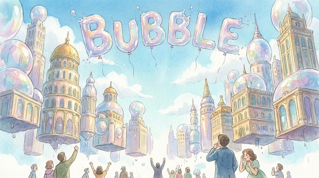 주식, 부동산 등의 자산 가격이 내재된 실제 가치보다 비정상적으로 높게 치솟은 상태를 말합니다. 터지기 전까지는 계속 오를 것 같지만, 결국에는 터져서(burst) 가격이 폭락하게 됩니다.