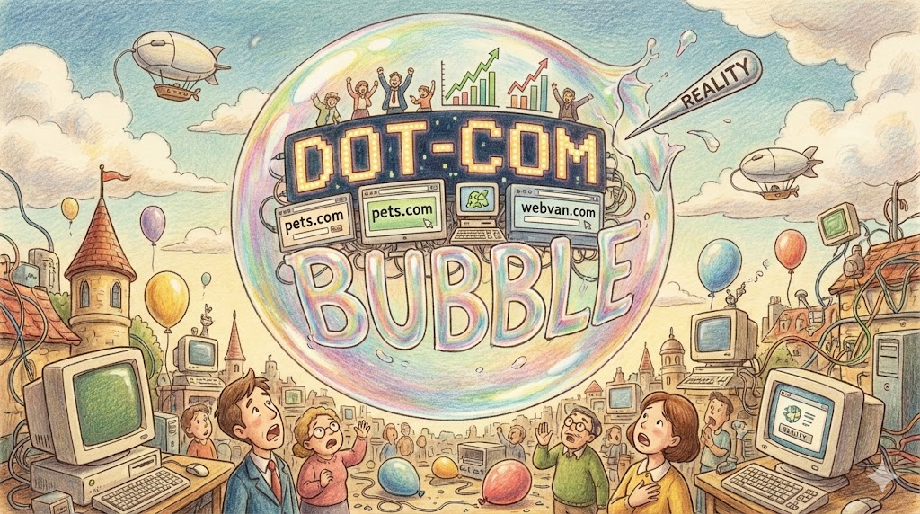 1990년대 후반부터 2000년대 초반, 인터넷 관련 기업(닷컴 기업)들의 주가가 실적과 상관없이 미친 듯이 폭등했다가 폭락한 역사적인 사건을 가리킵니다.