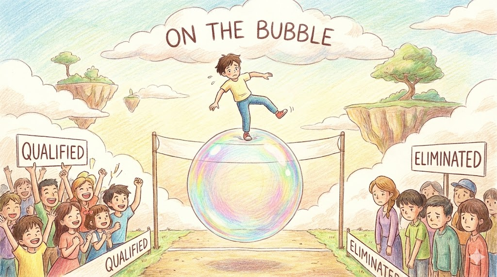on the bubble은 스포츠나 선발 과정에서 합격과 탈락의 '경계선에 있는(아슬아슬한)' 상태를 뜻합니다. 터질지 안 터질지 모르는 방울 위에 앉아 있는 것과 같습니다.