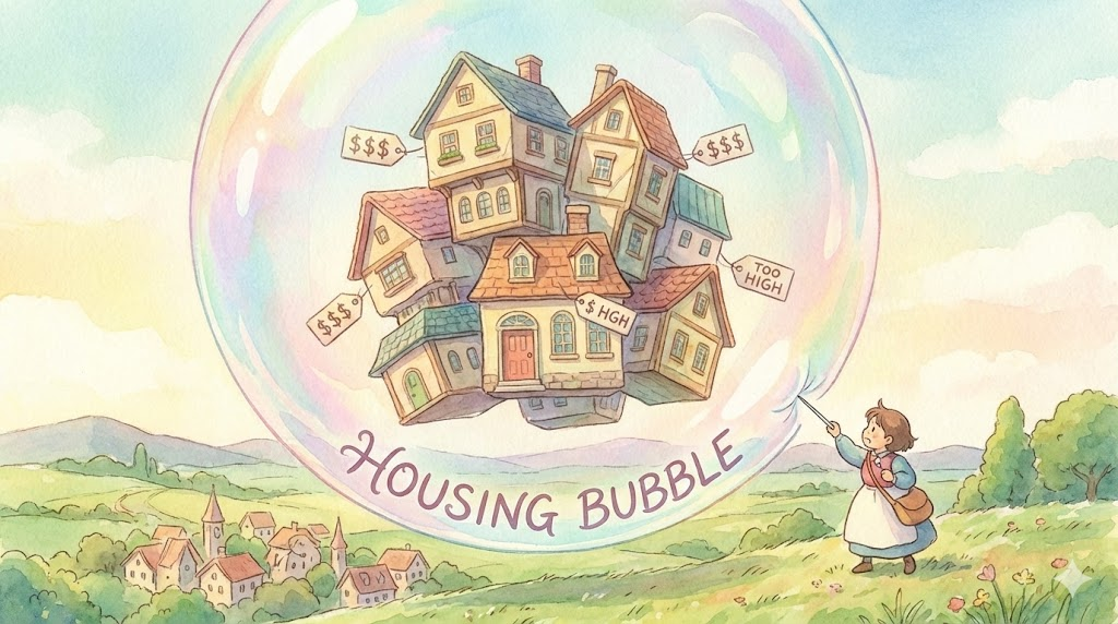 집값이 실제 가치나 소득 수준에 비해 턱없이 비싸게 형성된 상태입니다. 투기 수요가 몰려 가격이 급등할 때 쓰며, 이 거품이 꺼지면 경제에 큰 타격을 줍니다.