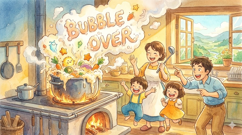 - The pot is bubbling over on the stove. (가스레인지 위에서 냄비가 끓어 넘치고 있다.)