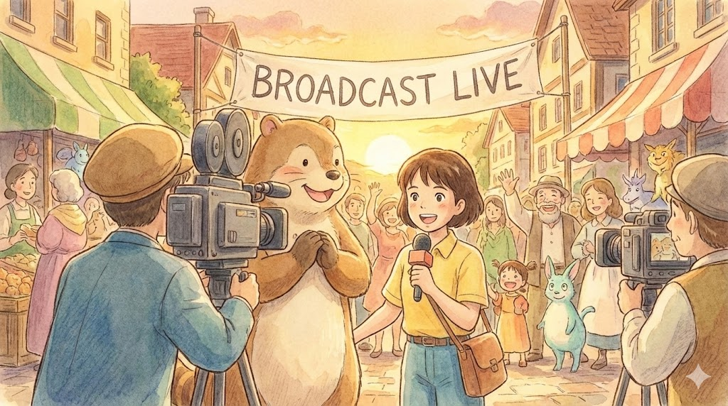 - 해석: 동사구로 쓰여 현장에서 실시간으로 방송하는 행위를 나타냅니다.