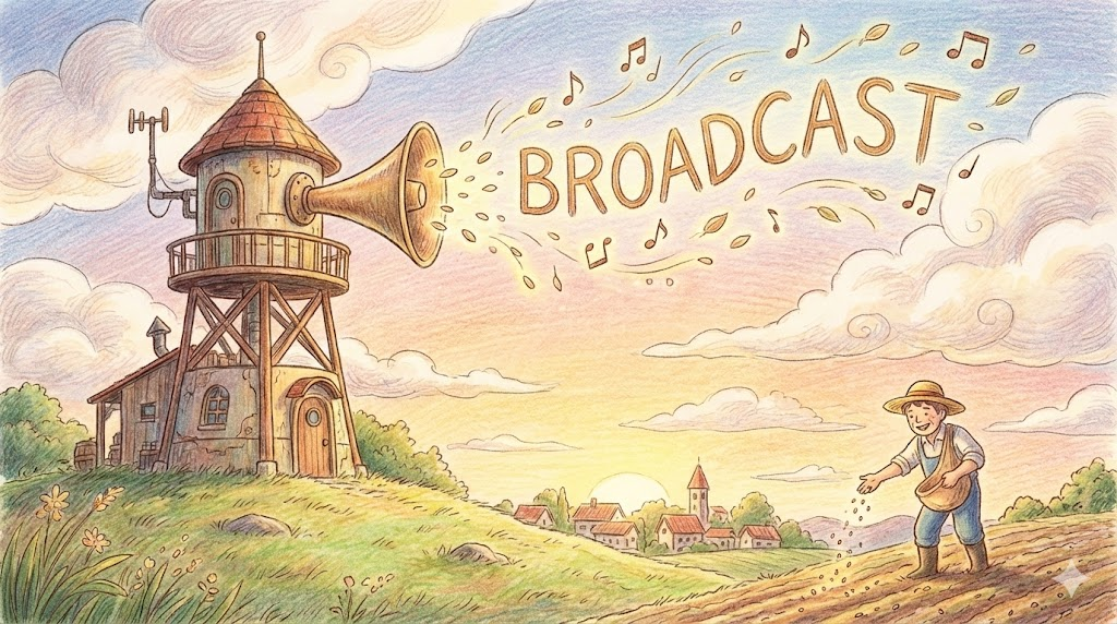 | 농업 용어 (씨를 흩뿌리다) | "넓게 퍼뜨림" | 파종 (농업) → 라디오/TV 송출 (미디어) → 소문 유포 (정보 전달) |